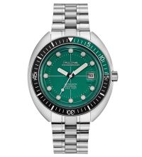 Das Runde Gehäuse ist 41 mm breit sowie 15 mm hoch und schmückt, natürlich abhängig vom individuellen Geschmack, nahezu jedes Handgelenk. Vom Gehäuse hebt sich die Drehbar, linksseitige Lünette dezent ab, ebenso die Verschraubte Krone. Beim Gehäuseboden der Uhr handelt es sich um einen Edelstahlboden, verschraubt, der den Schlusspunkt für ein ansprechendes Design setzt.