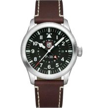 aus der Modell-Serie P-38 Air Pilot GMT 42mm 100M. Die GMT Funktion zur Anzeige einer zweiten Zeitzone ist anhand des pfeilförmigen und farblich hervorgehobenen zweiten Stundenzeigers komfortabel ablesbar. Heimatzeit und Ortszeit behalten Sie so immer im Blick. Eine perfekte Wahl, wenn Sie einen Zeitmesser mit einem