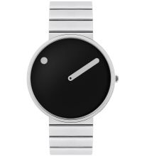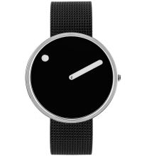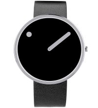 Picto® stellt die Idee einer klassischen Uhr mit zwei Zeigern und einem Zifferblatt mit Zahlen in Frage. Hier wird die Stunde durch einen Punkt auf dem drehbaren Zifferblatt angezeigt, während die Minuten durch einen herkömmlichen Zeiger angezeigt werden. |  |