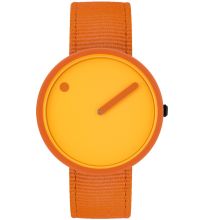 Picto® stellt die Idee einer klassischen Uhr mit zwei Zeigern und einem Zifferblatt mit Zahlen in Frage. Hier wird die Stunde durch einen Punkt auf dem drehbaren Zifferblatt angezeigt, während die Minuten durch einen herkömmlichen Zeiger angezeigt werden. |  |