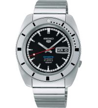 In der neuen Seiko 5 Sports Heritage Design Re-creation arbeitet das bewährte Automatikwerk Kaliber 4R36. Das Retro-Design wird so mit modernster Technologie veredelt. Das in schwarz und silber erhältliche Zifferblatt mit Sonnenschliff und der rote Sekundenzeiger orientieren sich eng am klassischen Design. Typisch für die 5 Sports Kollektion findet sich die Wochentags- und Datumsanzeige auf der Drei-Uhr-Position, die Krone auf der Vier-Uhr-Position. Das Logo ist auf der ursprünglichen 12-Uhr-Position platziert. Auf dem Boden des kissenförmigen Gehäuses finden sich die Gravur "Limited Edition" und die Seriennummer. Die charakteristische, drehbare Lünette zeigt von 0 bis 15 Markierungen in Ein-Minuten-Schritten, danach in Fünf-Minuten-Schritten. Dies sorgt für eine prägnante Abgrenzung zum Zifferblatt.