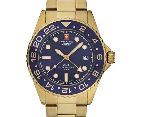 Zusätzliche Freude an Ihrer neuen Swiss Alpine Military Uhr wird Ihnen das hochwertig verarbeitete Armband aus Edelstahl – Farbe: Gold – mit Faltschließe bereiten. Das Edelstahl-Armband bietet einen hohen Tragekomfort und kann bis zu einem maximalen Handgelenkumfang von 210 mm getragen werden.